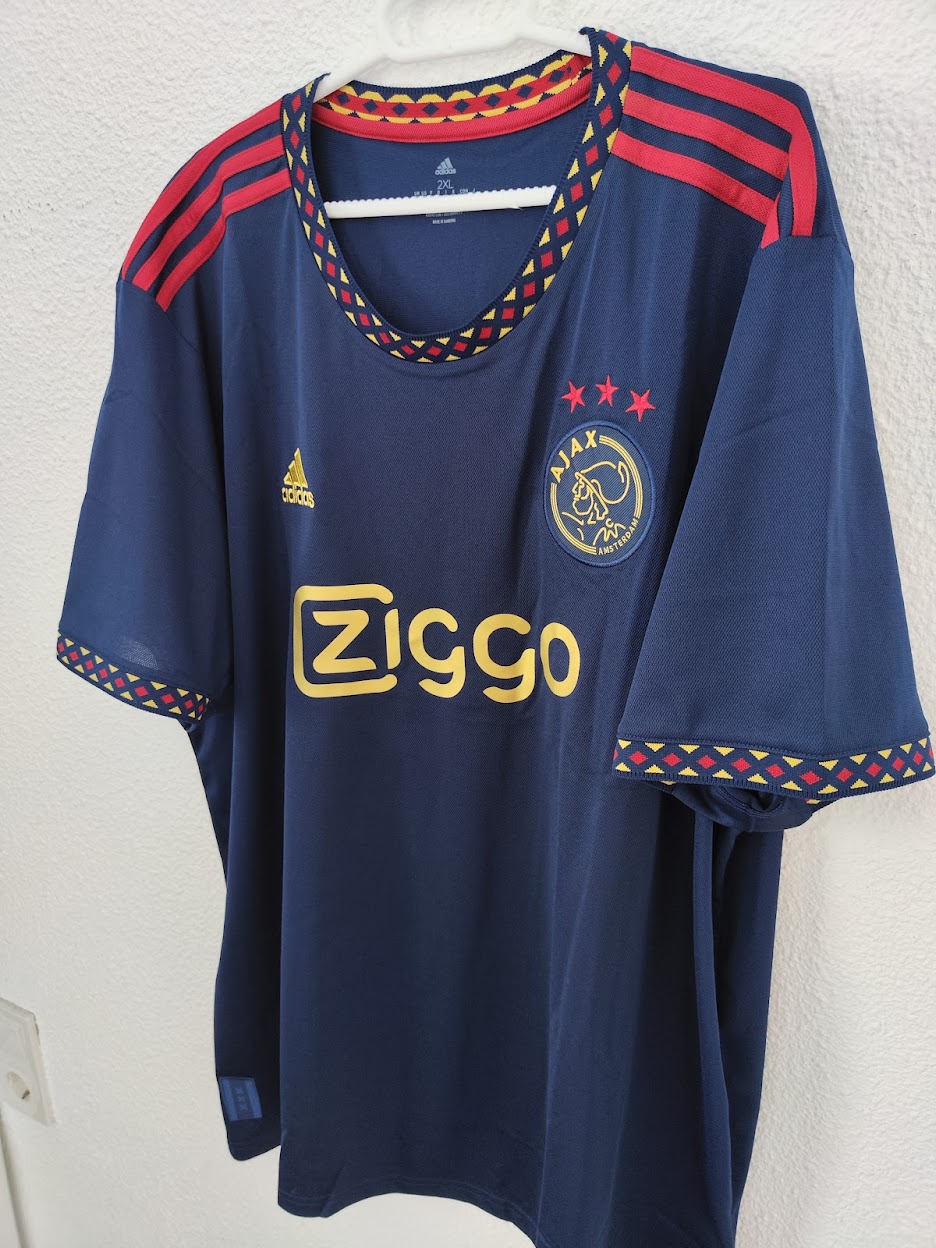 Camiseta oficial de visitante del Ajax Amsterdam temporada 2022-23, fabricada por Adidas Aeroready. Base azul marino con escudo dorado, patrocinador Ziggo en dorado y las tres rayas Adidas en rojo. El detalle más distintivo del diseño es el patrón geométrico en cuello y puños inspirado en la Cruz de San Andrés, símbolo central de la bandera de Ámsterdam, combinando rojo y amarillo oro en referencia al escudo de la ciudad.
